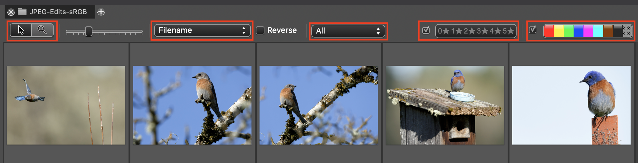 Above the series of thumbnails, you can find controls to switch from selector to loupe cursor. You also have options to sort and filter thumbnails within a contact sheet, such as sorting by image width or displaying only certain star ratings.