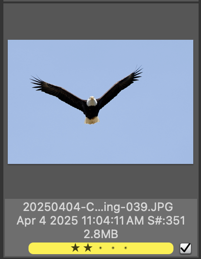 Each thumbnail image shows the color class (the yellow bar in this example), tags (the checkbox), and the star rating of the image. You can change or set these directly in the contact sheet.