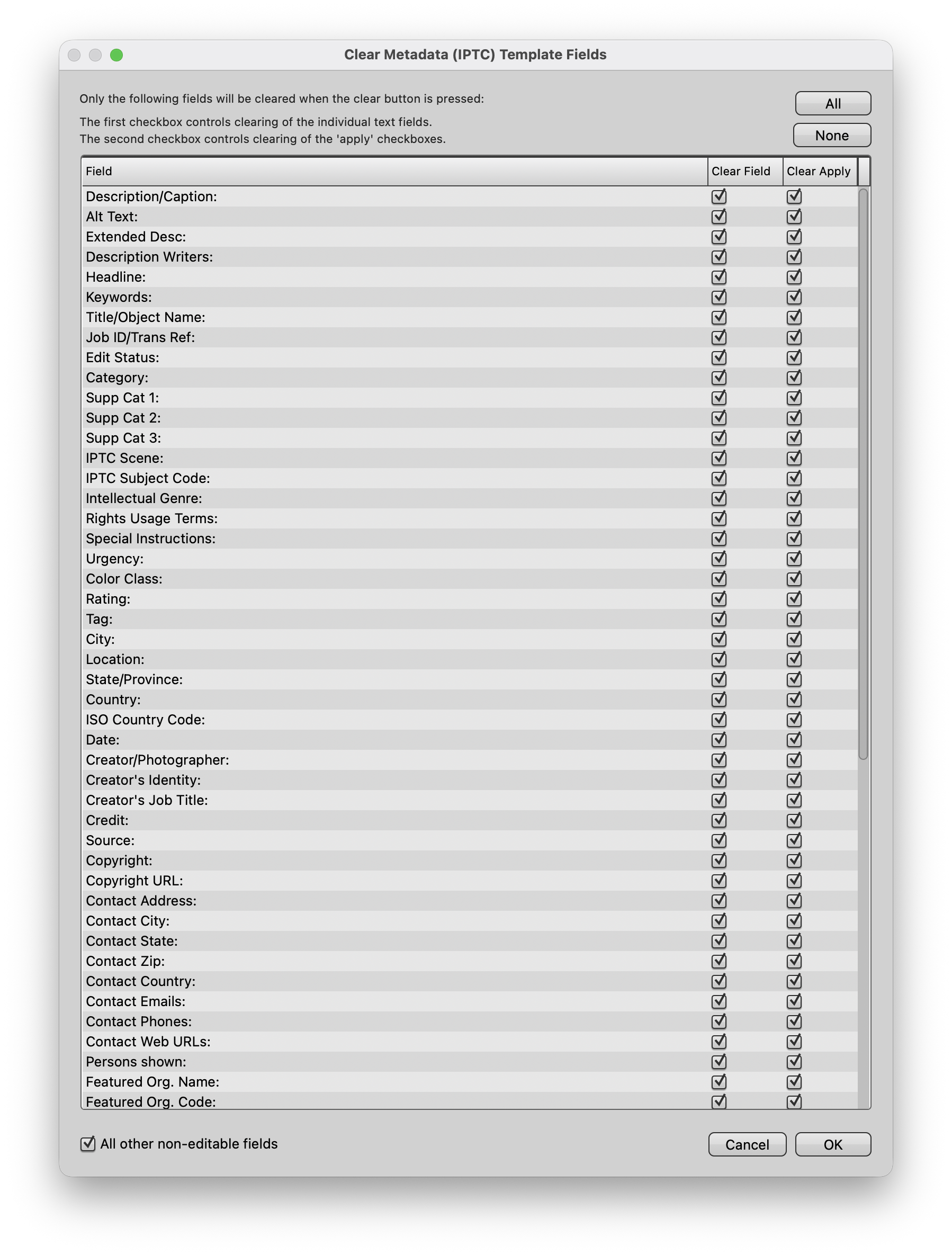 To clear all of the checkboxes in the Clear Field and Clear Apply columns, select the None button.
