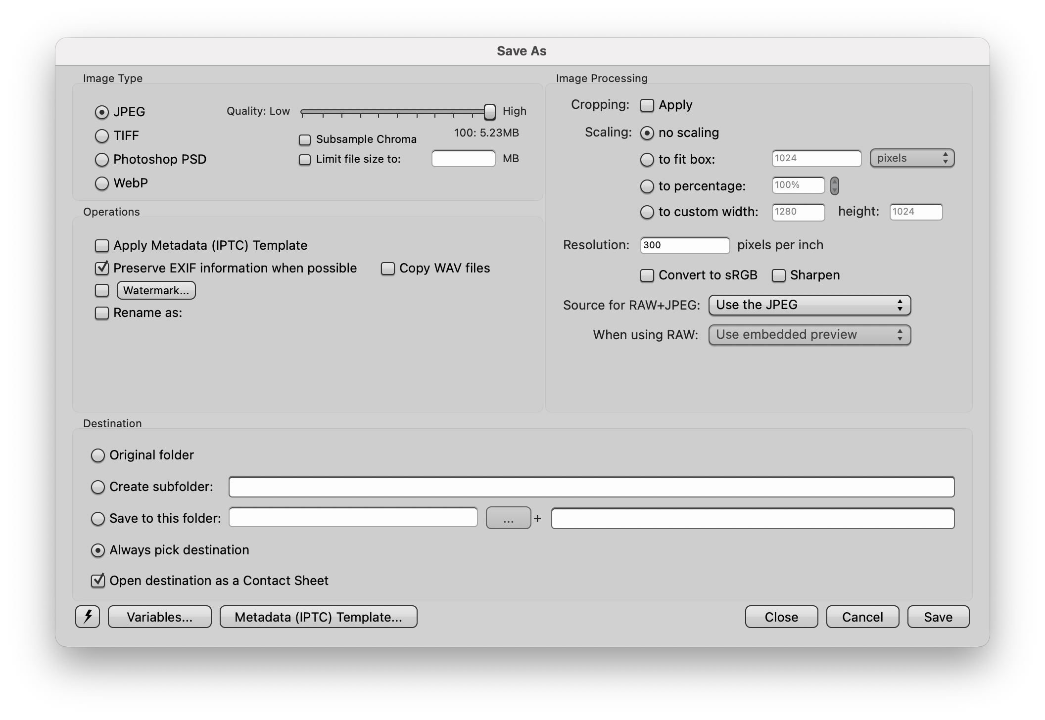 Once the options in each of these sections is set to the requirements of the files you would like 'Save As' to produce, MacOS users can click 'Save', and Windows users can click 'OK', and Photo Mechanic will perform the Save As operation on each image in your selection.