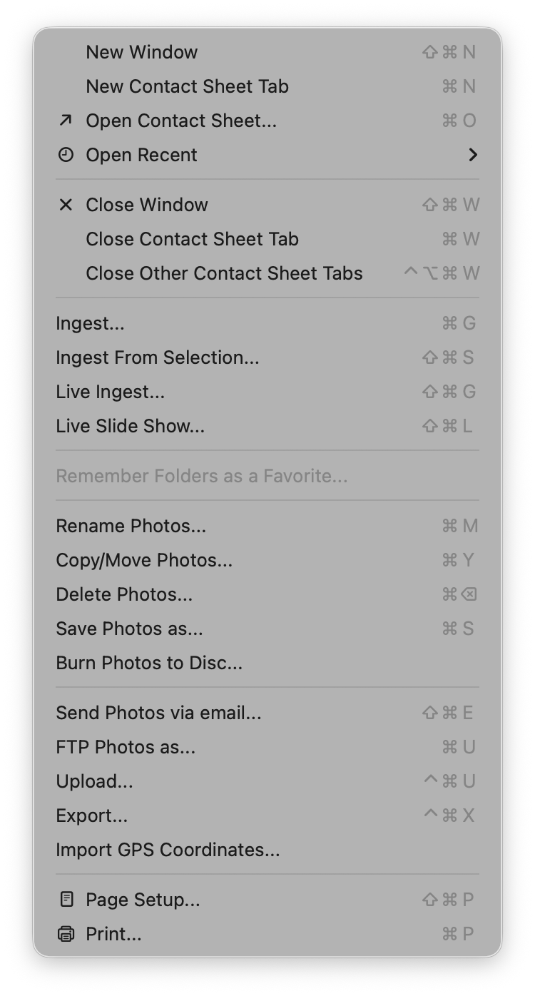 New Contact Sheet Tab (macOS only) - Opens a new Contact Sheet tab