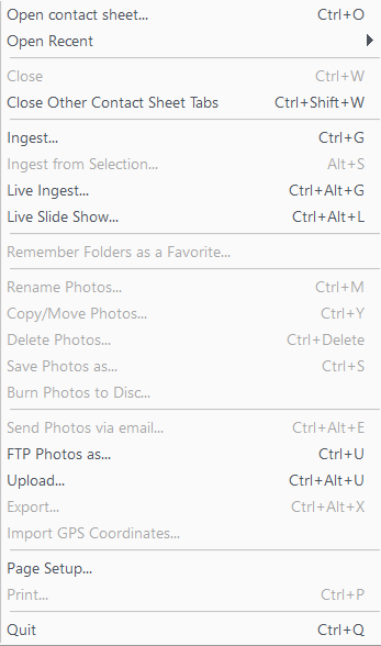 Open Recent - Contains a list of up to 10 folders that were recently opened in a Contact Sheet. Select a folder from the list to open it as a Contact Sheet.